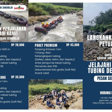 Wisata tubing di Desa Sukorejo menawarkan pengalaman menyusuri aliran Sungai Sawur, sungai alami yang berhulu di kawasan lereng Gunung Lawu bagian utara. Pengunjung dapat menikmati sensasi meluncur menggunakan ban karet besar mengikuti arus sungai sambil melihat hamparan pepohonan dan lanskap desa di sekitarnya. Aktivitas ini tergolong aman dan menyenangkan, sehingga cocok untuk wisata kelompok, pelajar, maupun keluarga. Waktu terbaik untuk menikmati wisata tubing adalah pada musim hujan hingga awal musim kemarau, ketika debit air sungai cukup deras dan stabil. Wahana ini dikembangkan oleh Kelompok Sadar Wisata (Pokdarwis) Deworejo sebagai bagian dari upaya memaksimalkan potensi alam desa dan menawarkan pengalaman adventure yang berbeda dari wisata desa organik biasa,